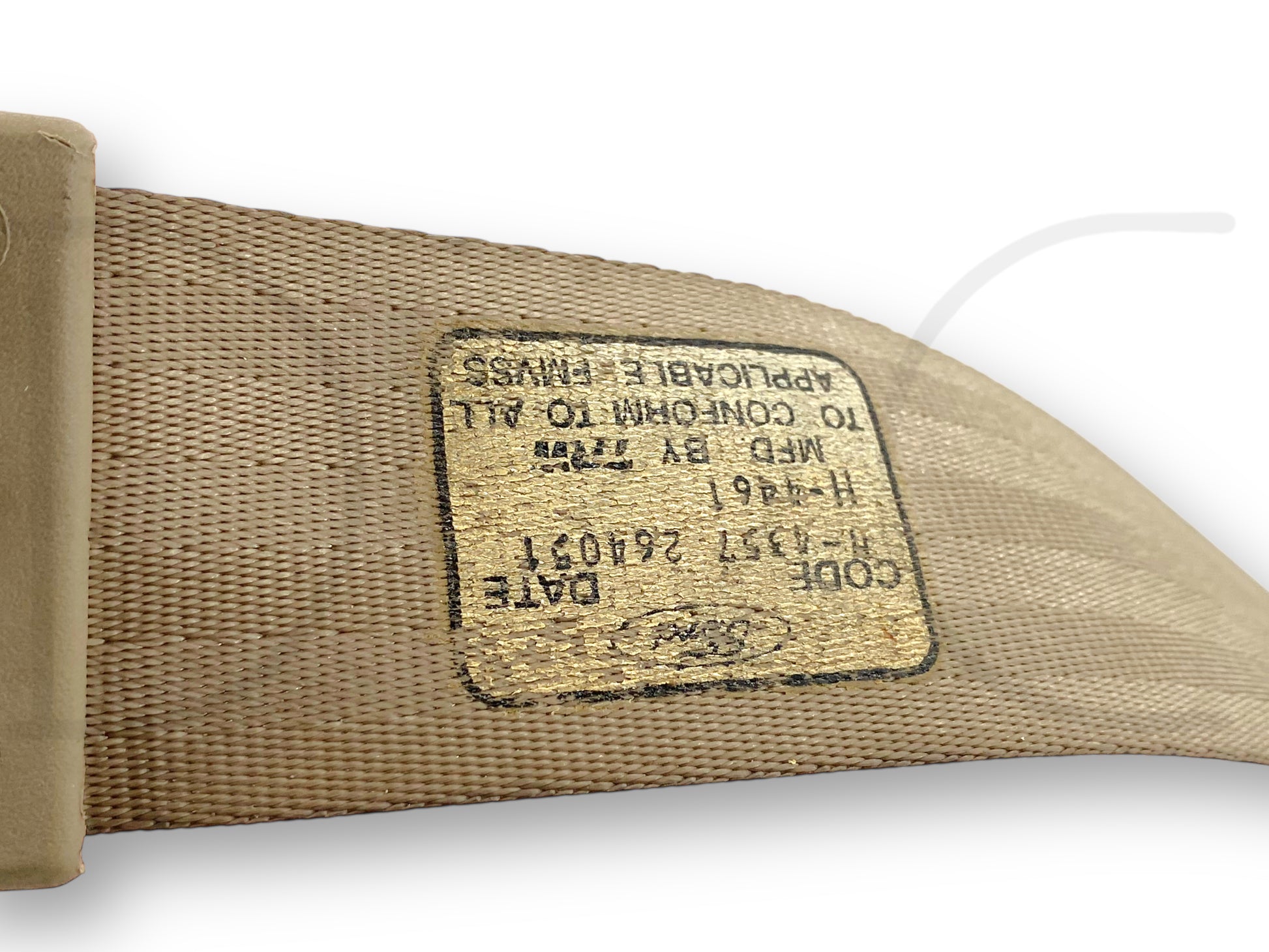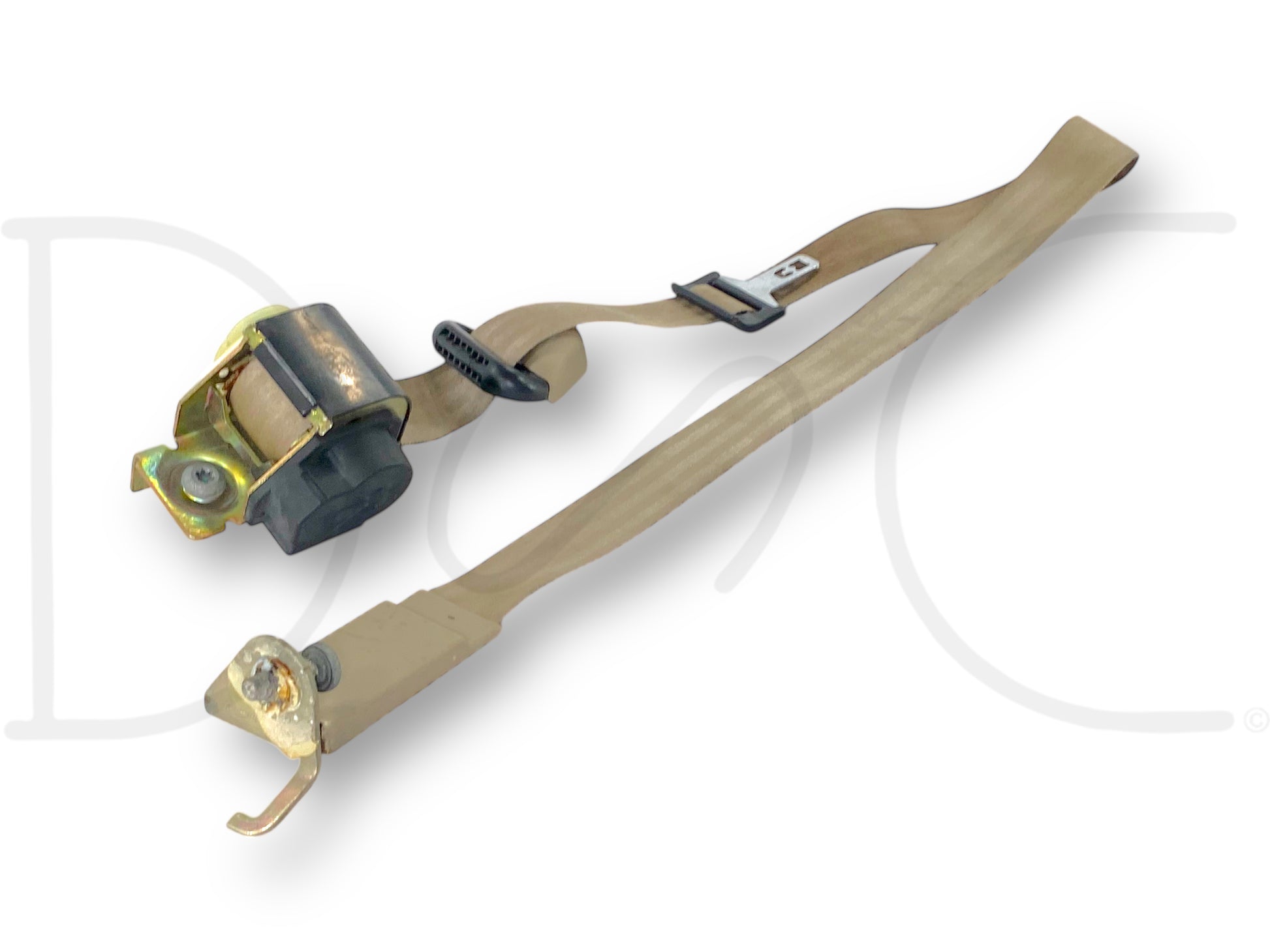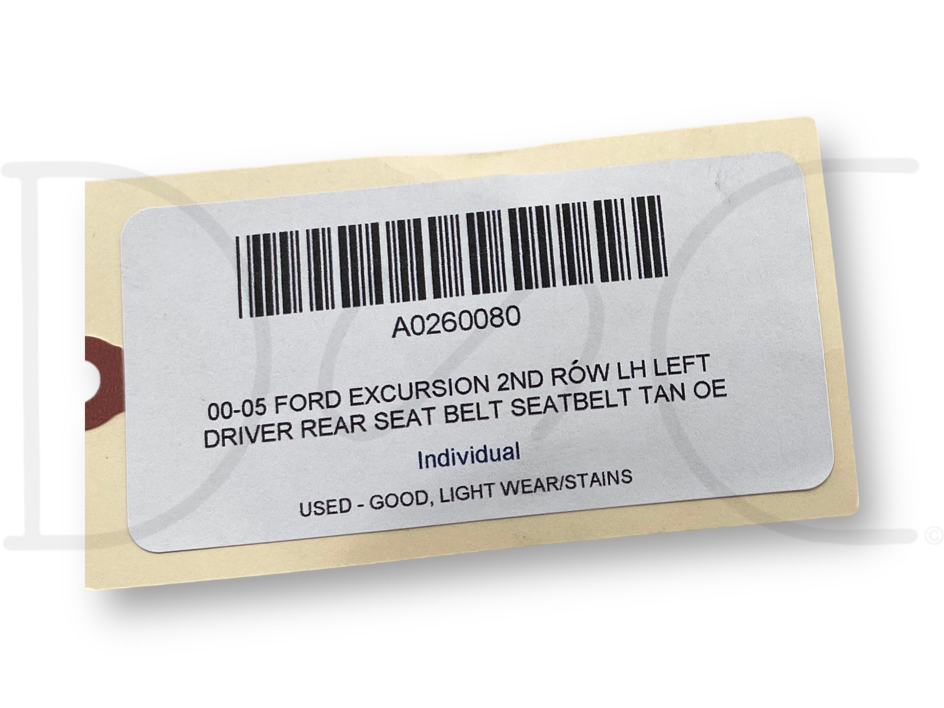 Description: Ford Excursion second row rear left hand driver side seatbelt seat belt assembly, tan, OEM