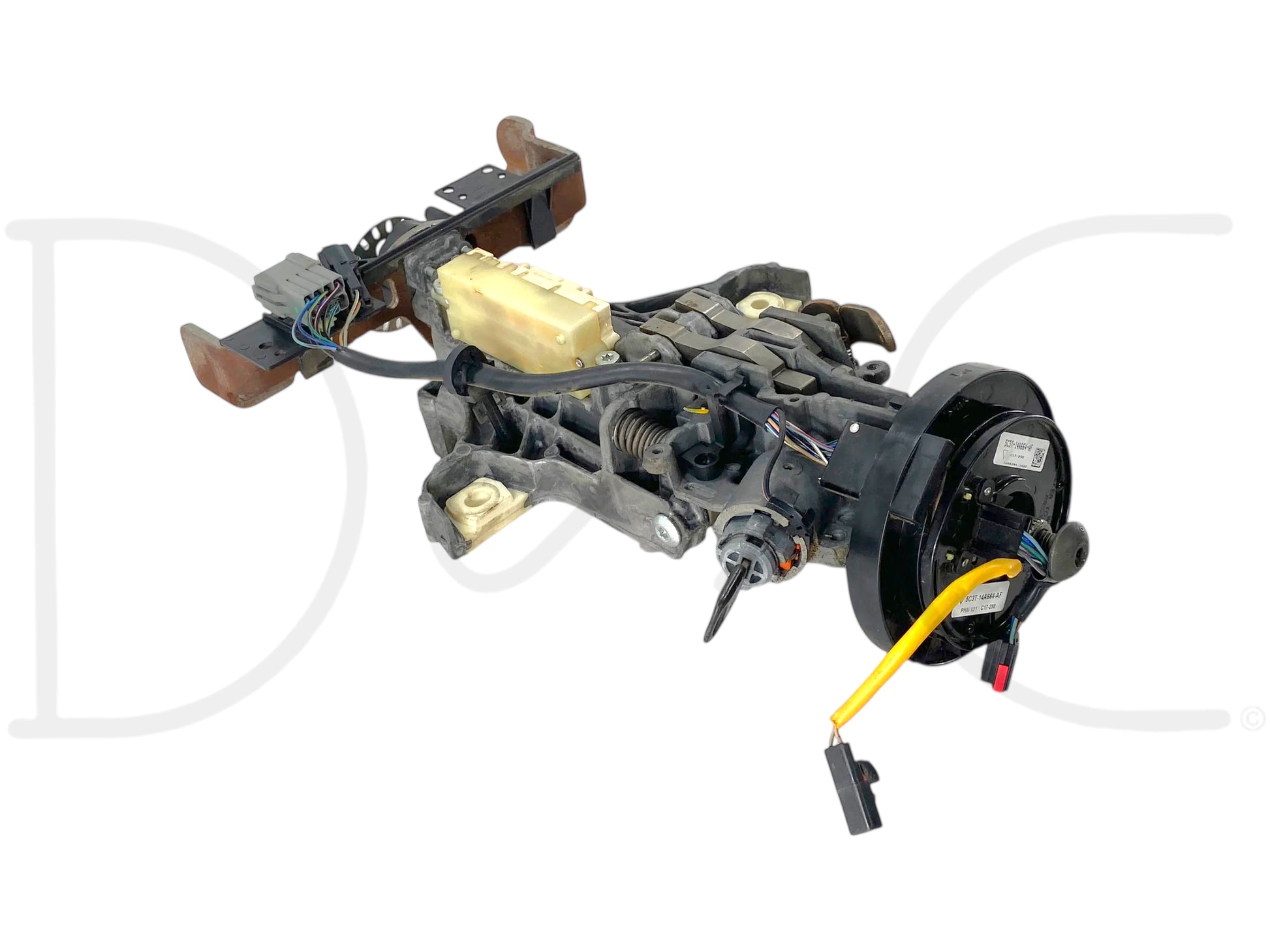 Description: Ford Super Duty steering column assembly, for automatic transmission, with ignition cylinder and key, with clockspring, clockspring supports temp / fan /cruise / stereo steering wheel controls, OEM