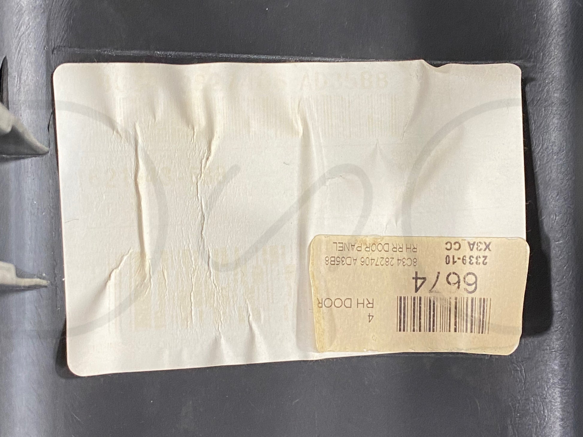 Description: Ford Super Duty extended cab right hand passenger side rear lower interior door panel card, black, OEM