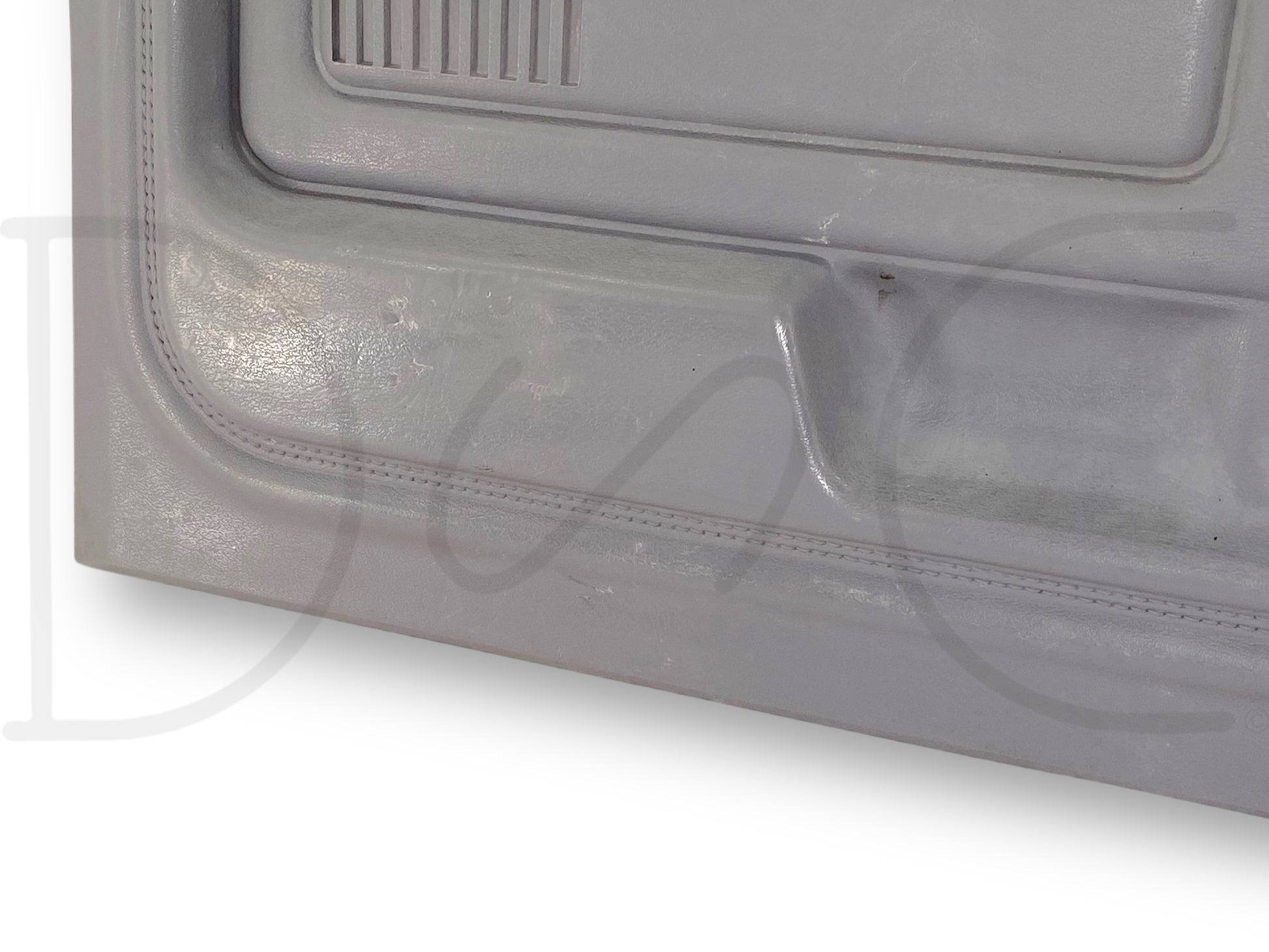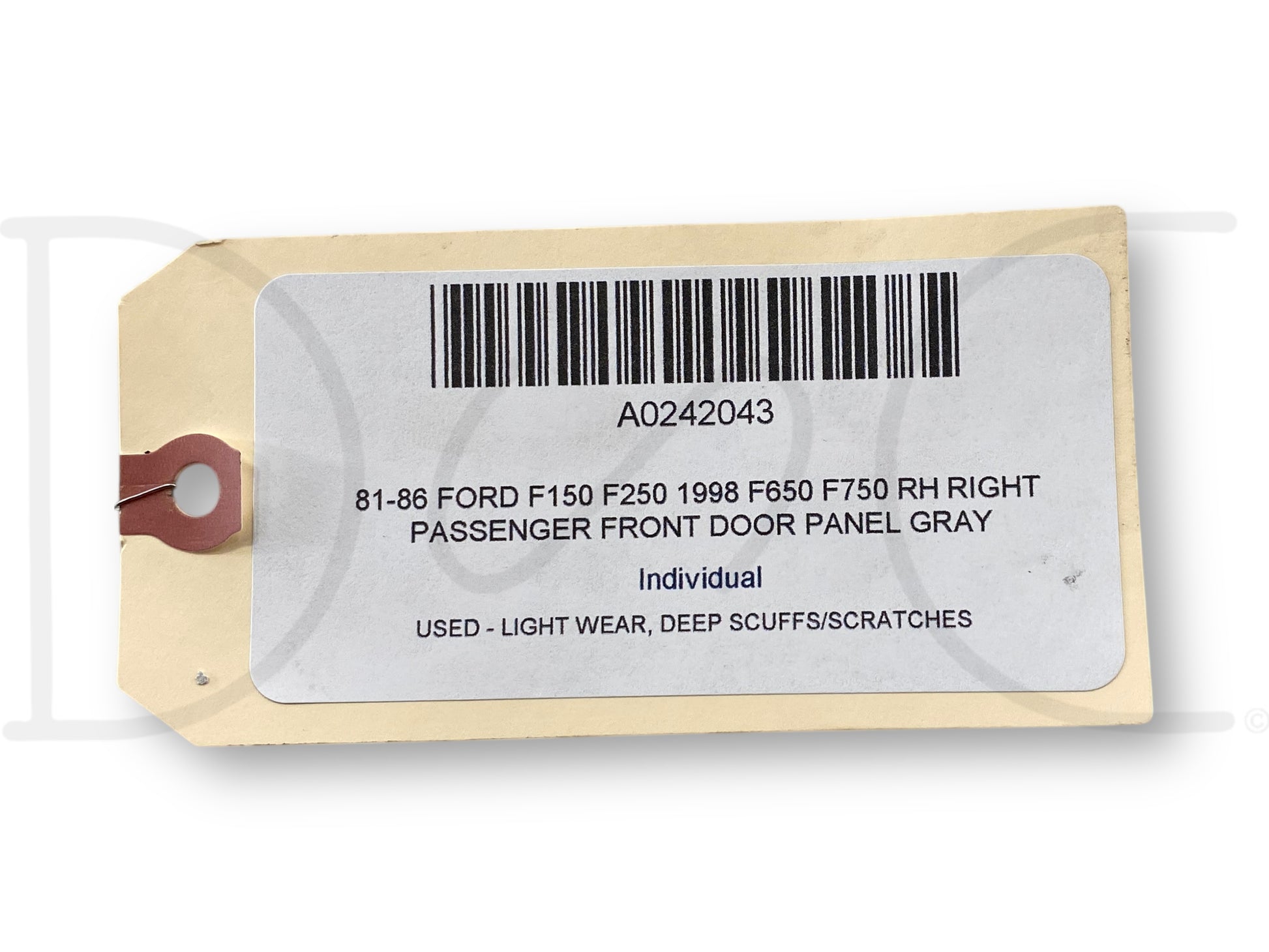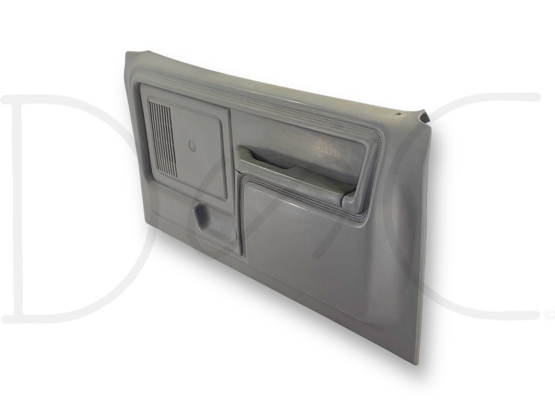 Description: Ford truck right hand passenger side front interior door panel card, grey, for trucks with manual windows & locks, OEM