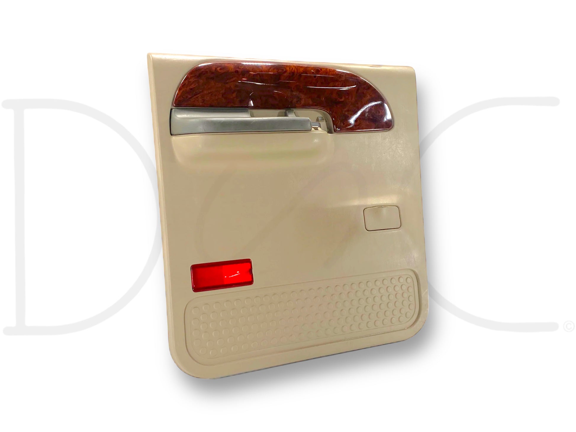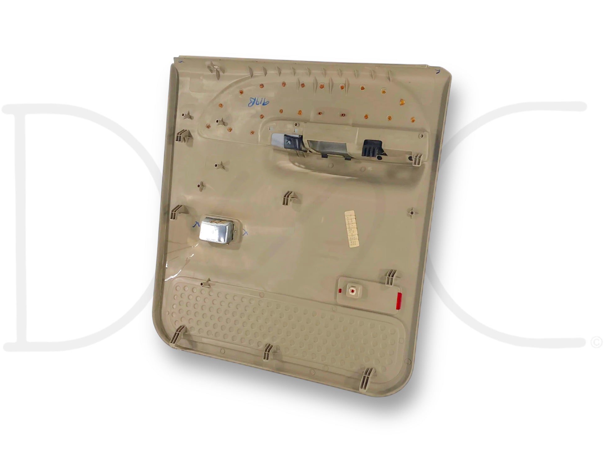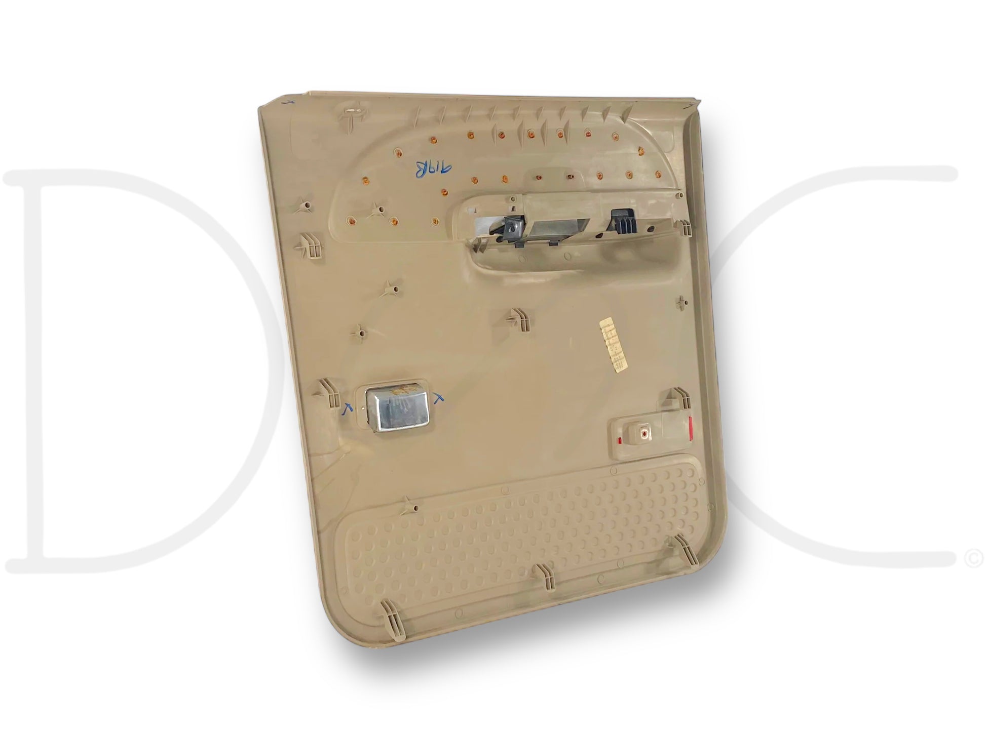 Description: Ford Super Duty left hand driver side rear interior door panel card, tan, for trucks with power windows, OEM