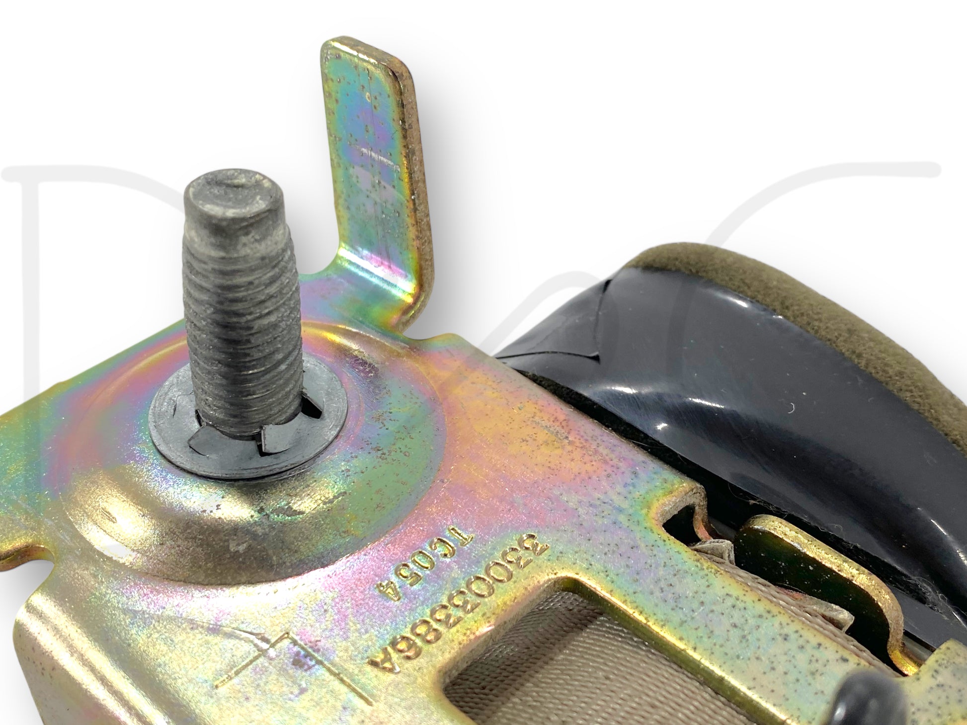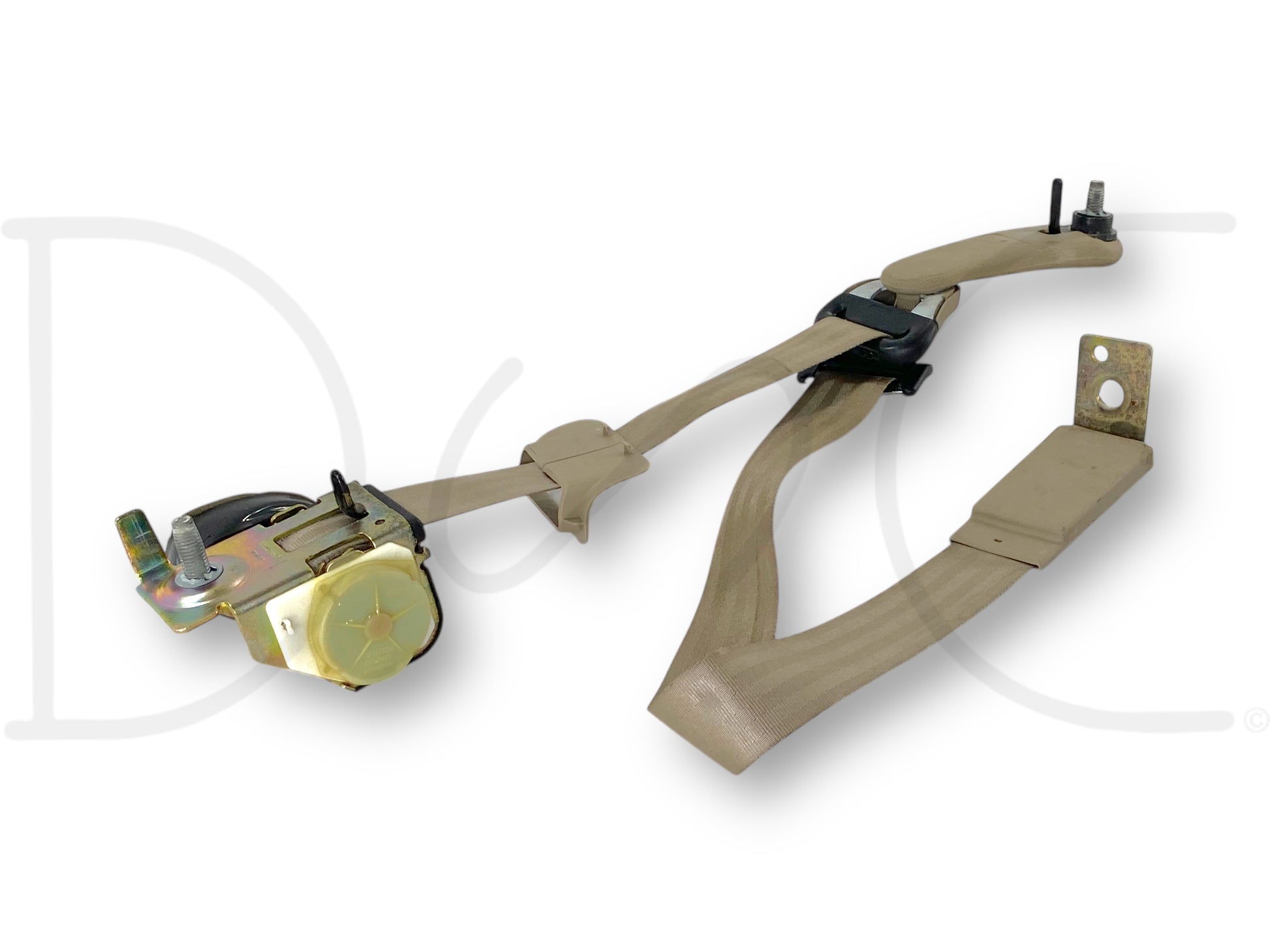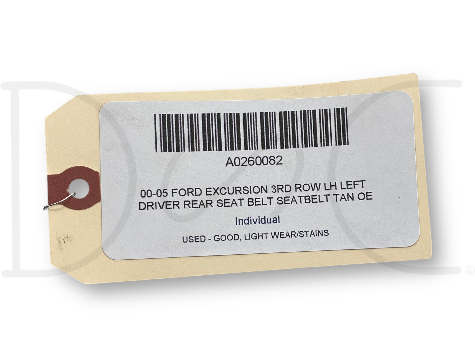 Description: Ford Excursion third row rear left hand driver side seatbelt seat belt assembly, tan, OEM