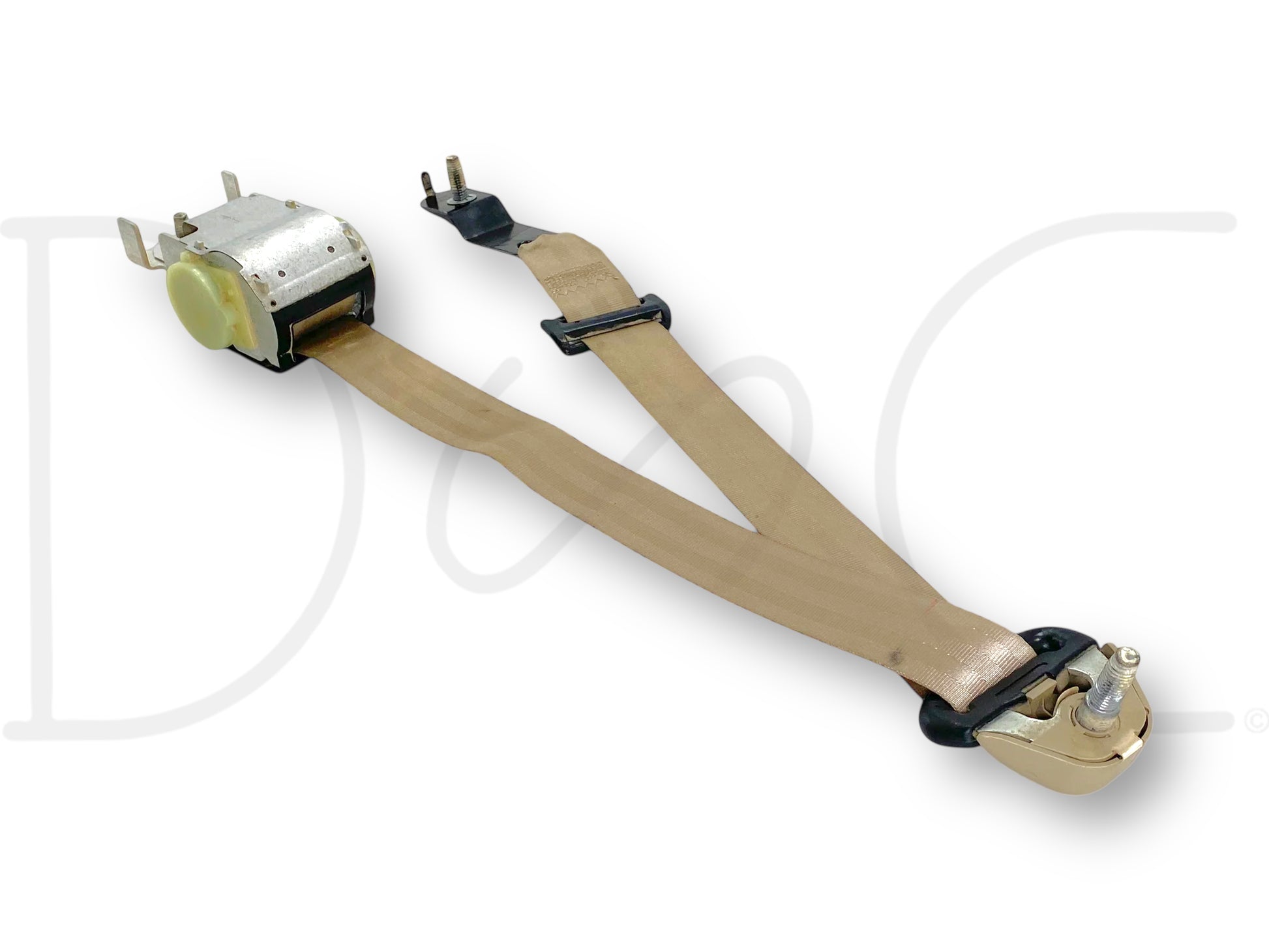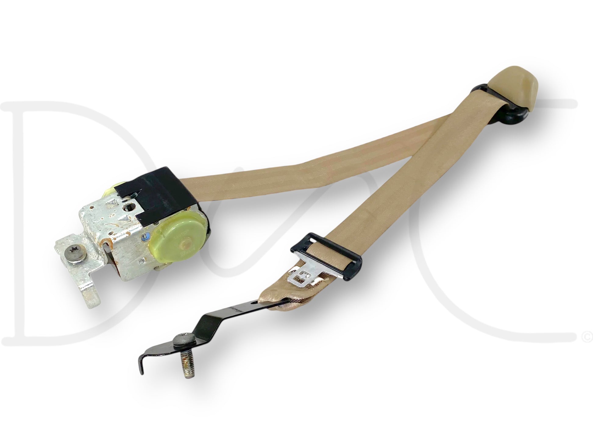 Description: Ford Super Duty extended cab rear left hand driver side seatbelt seat belt assembly, tan, OEM