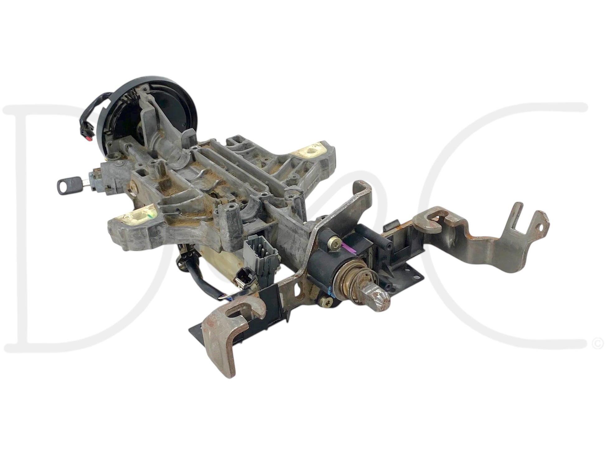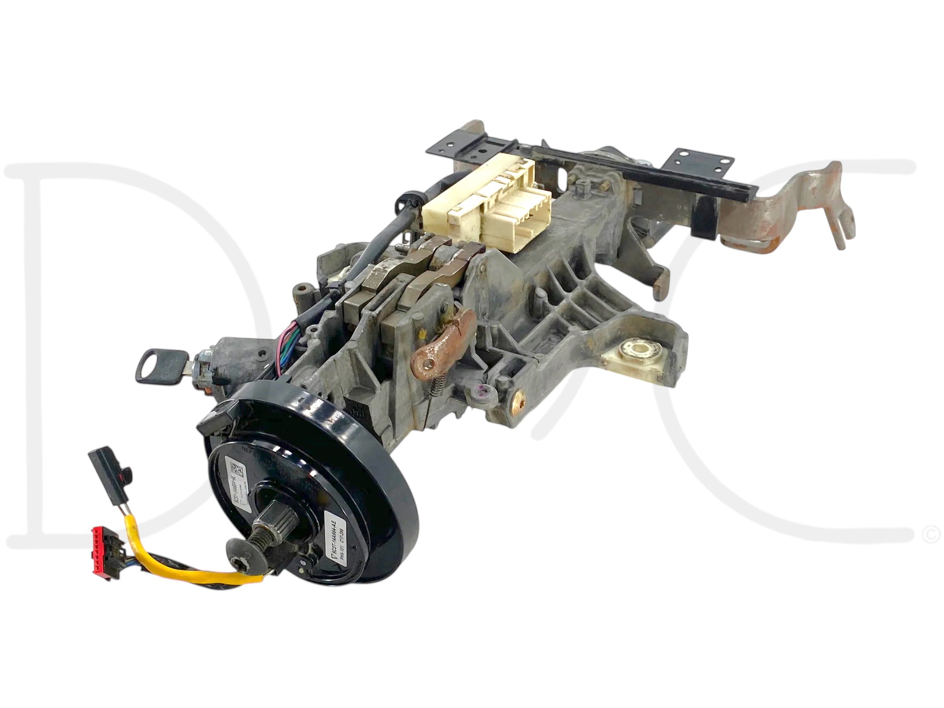 Description: Ford Super Duty steering column assembly, for automatic transmission, with ignition cylinder and key, with clockspring, clockspring supports temp / fan /cruise / stereo steering wheel controls, OEM