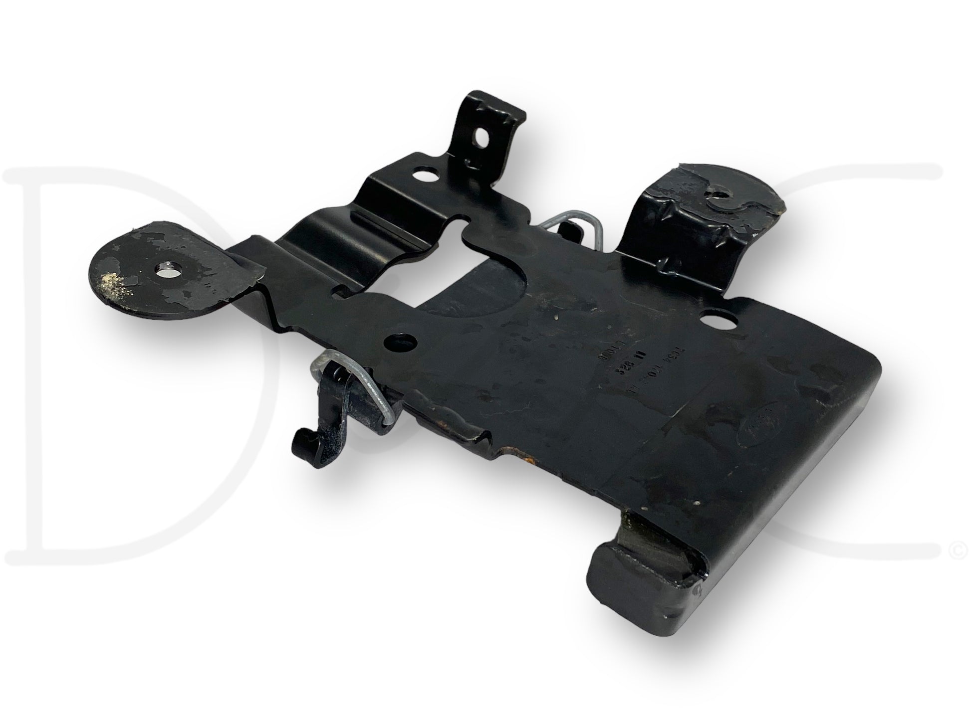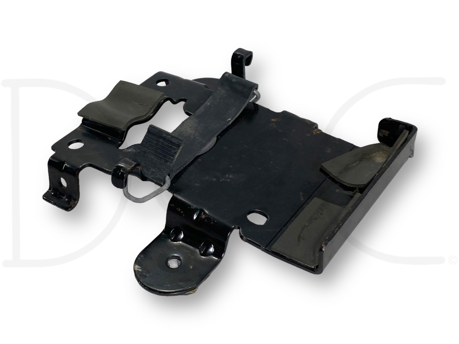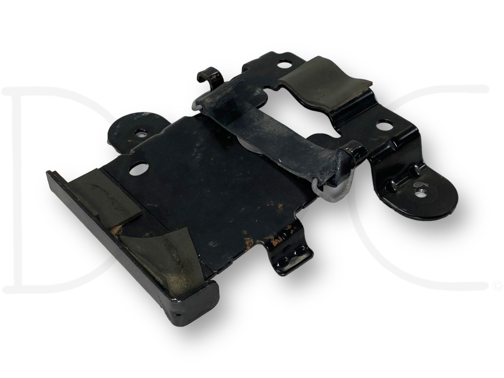Description: Ford Super Duty spare tire bottle jack mounting bracket, with rubber retainer strap, fits behind seat, OEM