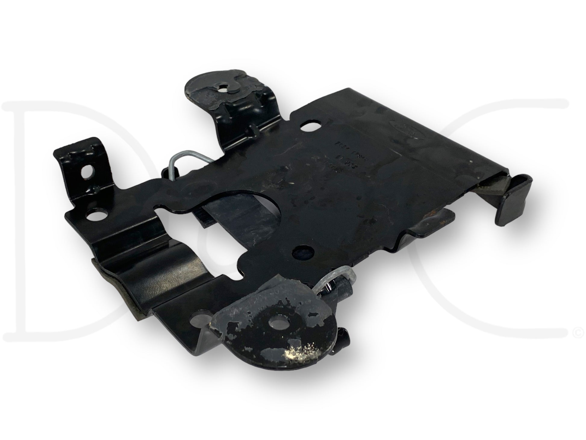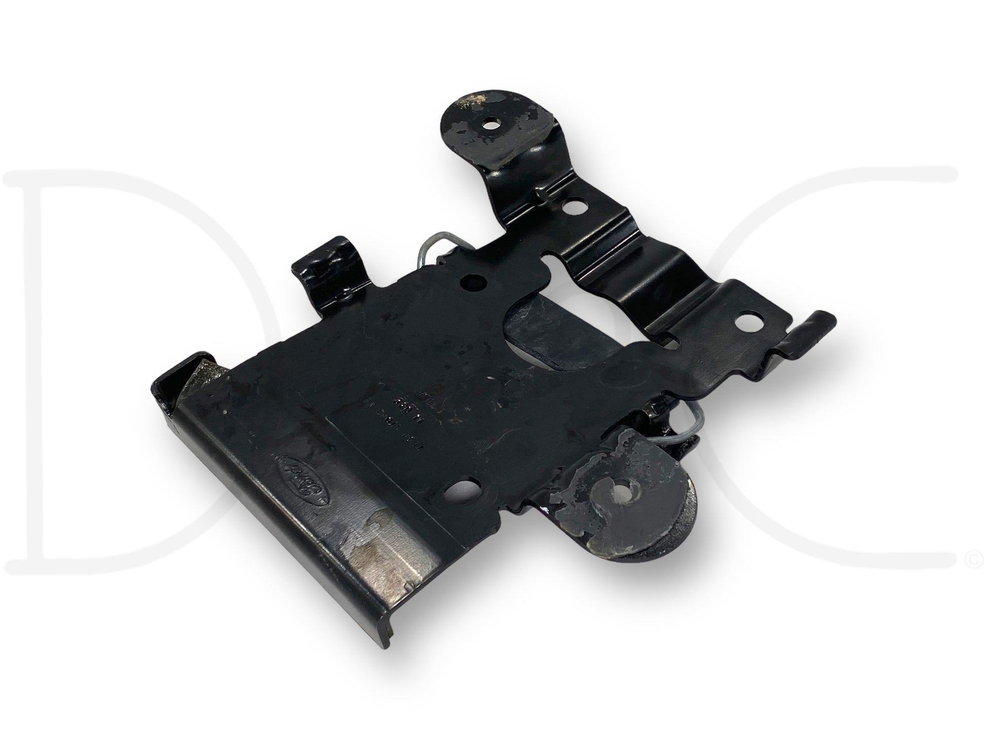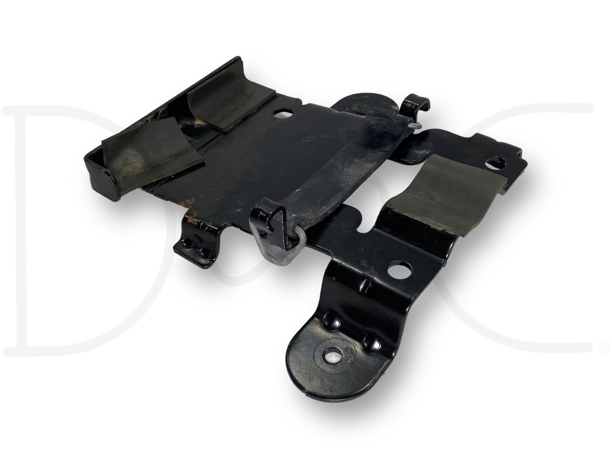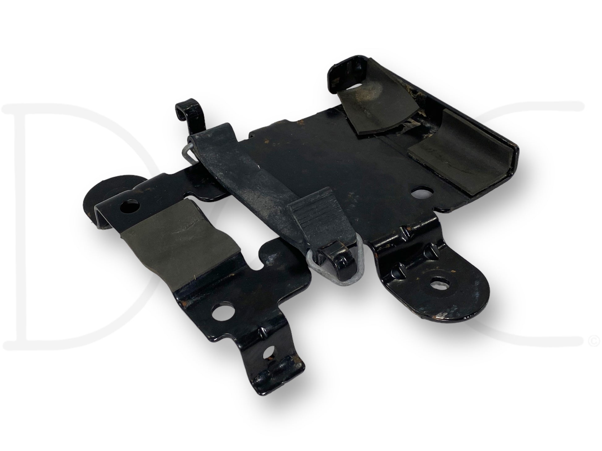 Description: Ford Super Duty spare tire bottle jack mounting bracket, with rubber retainer strap, fits behind seat, OEM