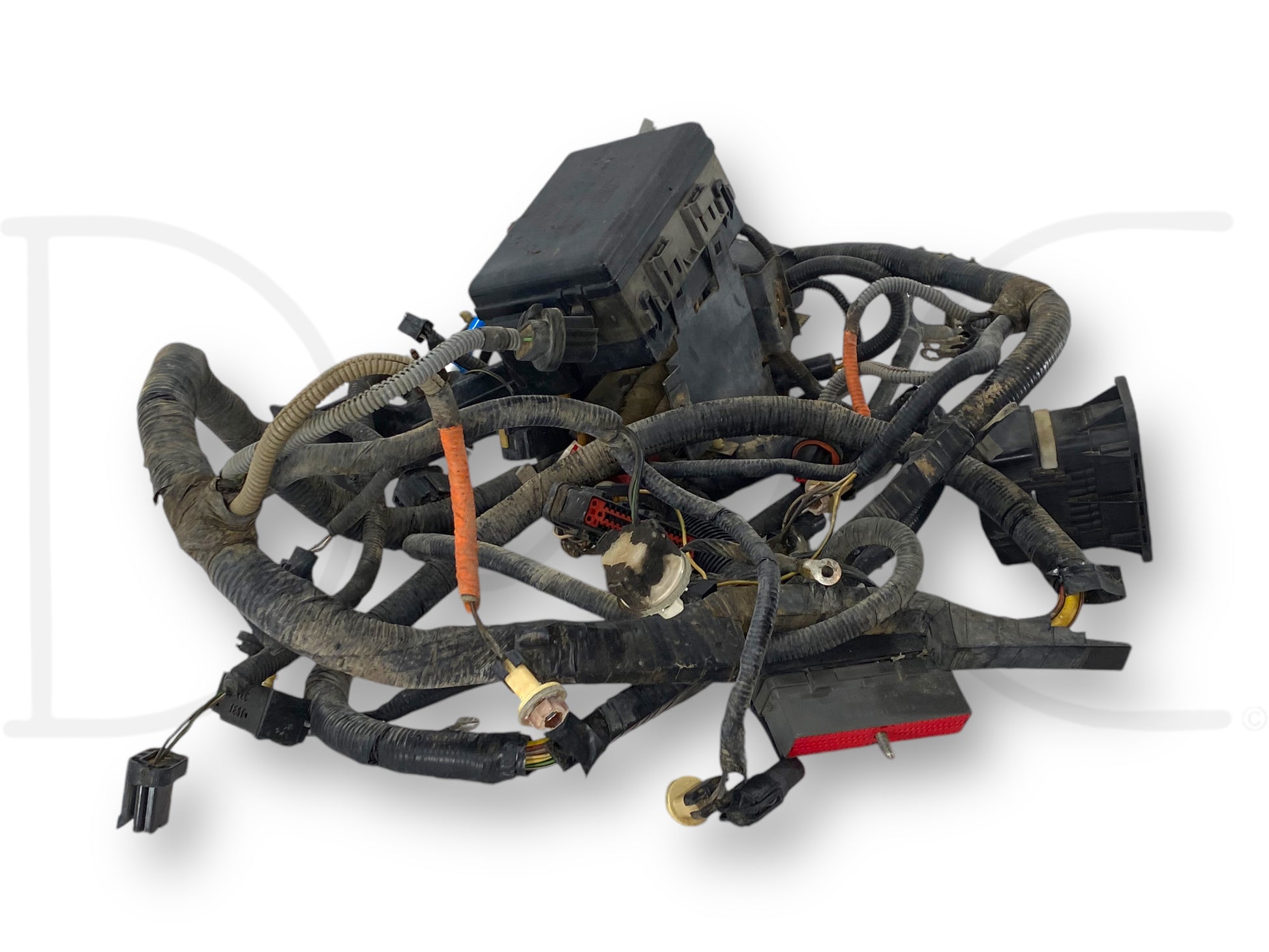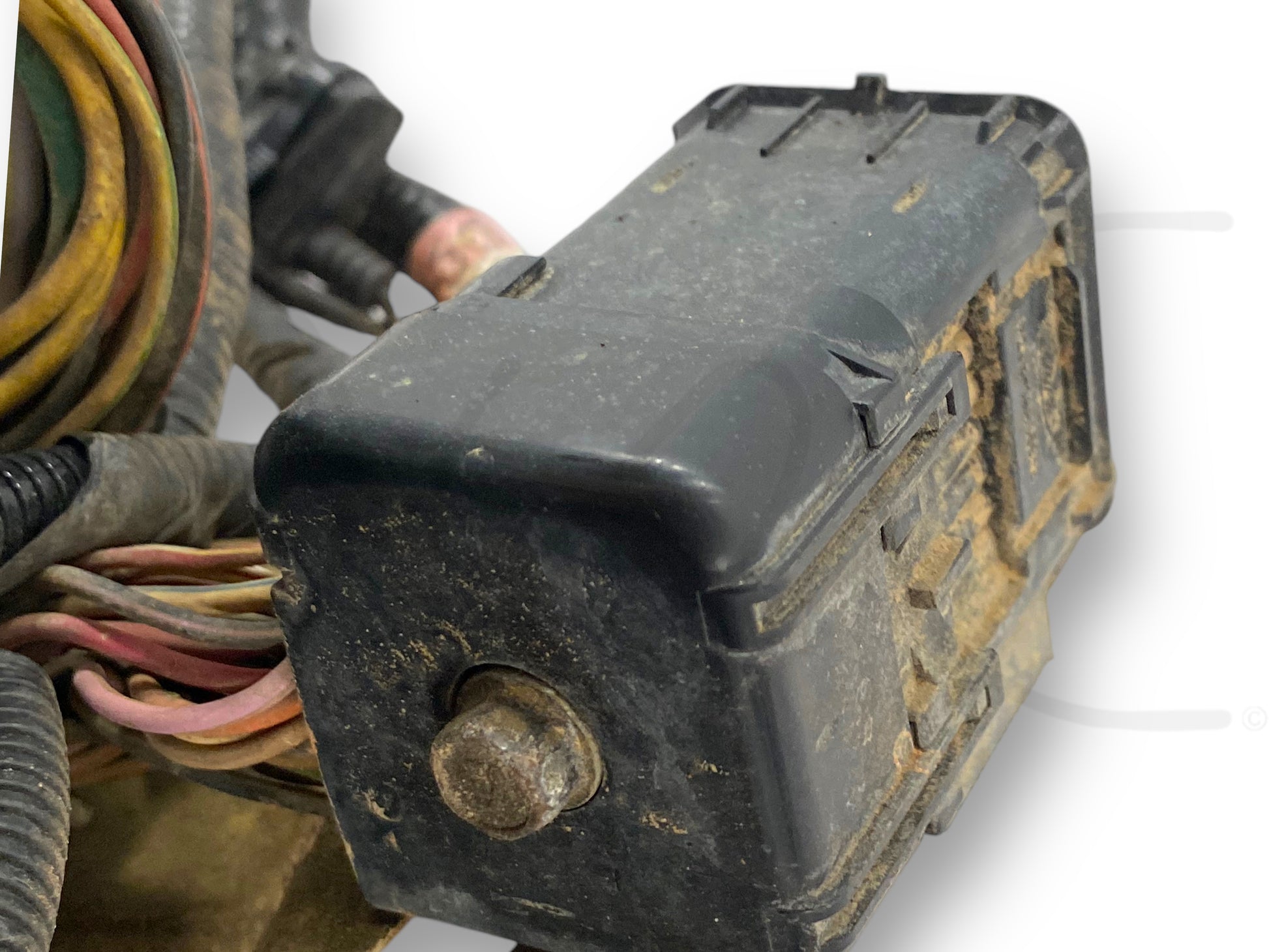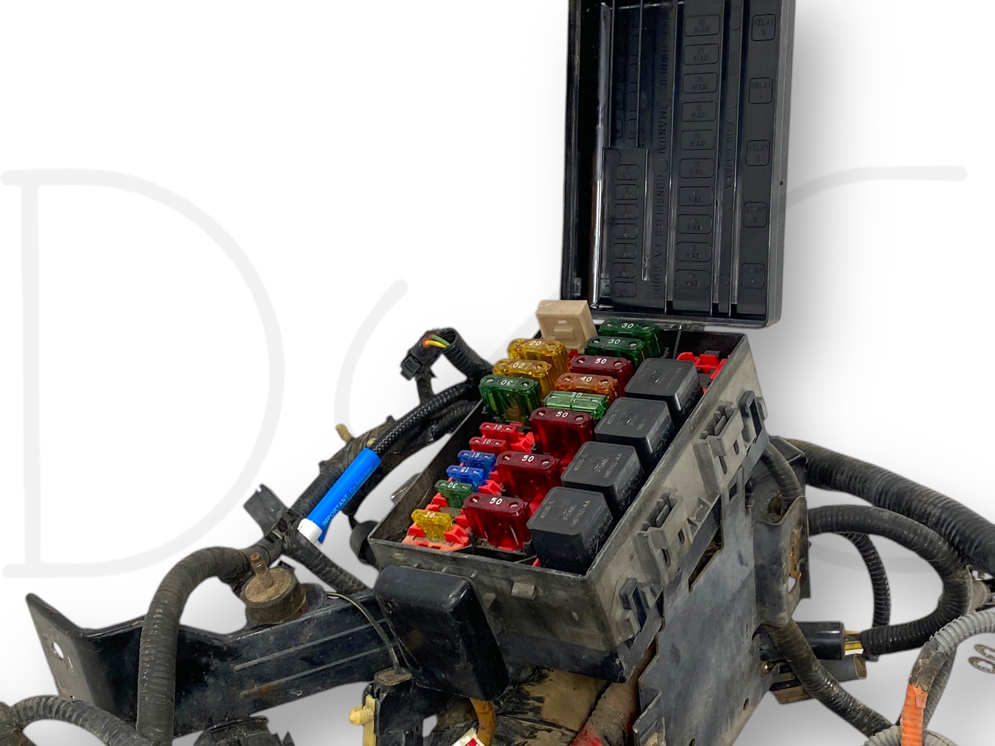 Description: Ford truck 7.3L Powerstroke diesel ZF5 manual transmission XLT front body engine bay wire harness and fuse box, for trucks with power windows and locks, OEM