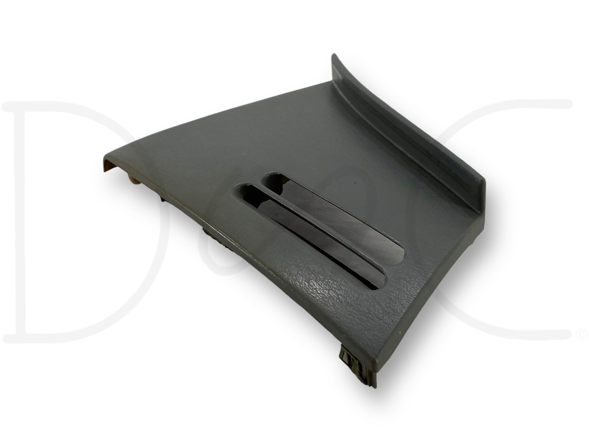 Description: Ford Super Duty left hand driver side dashboard end cap trim panel, side window defrost air vent, grey OEM