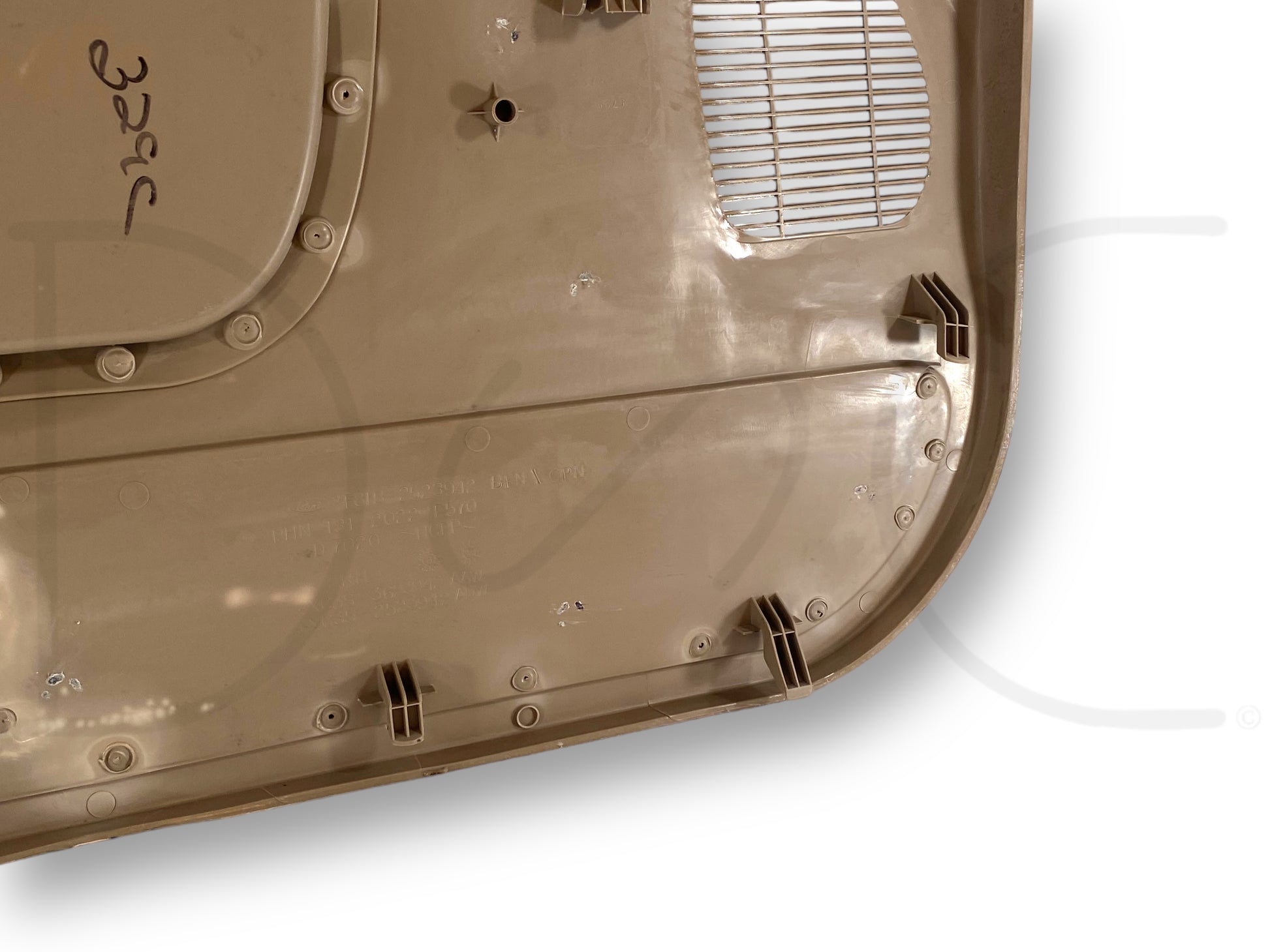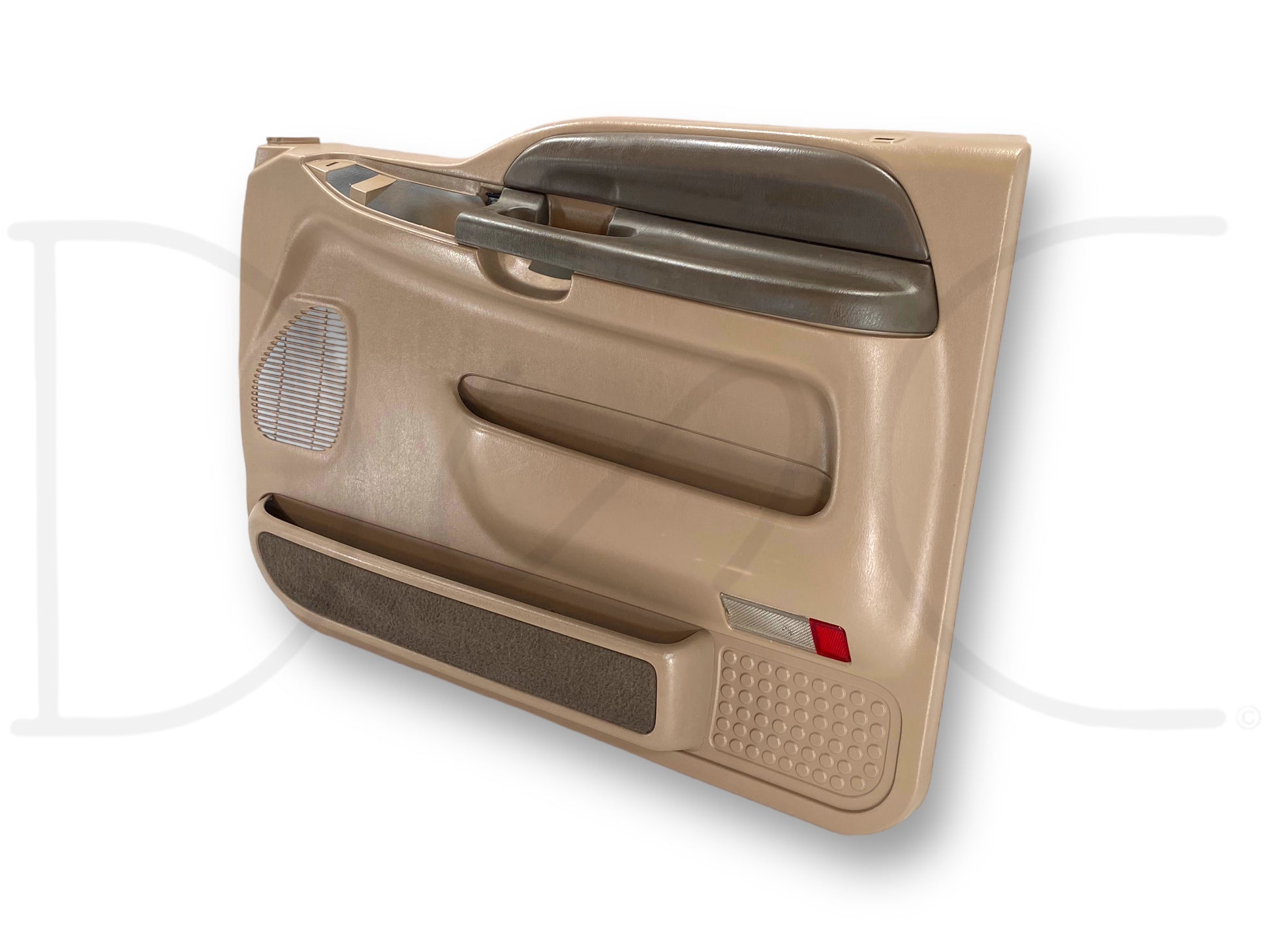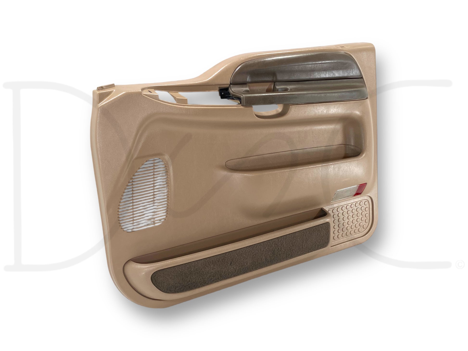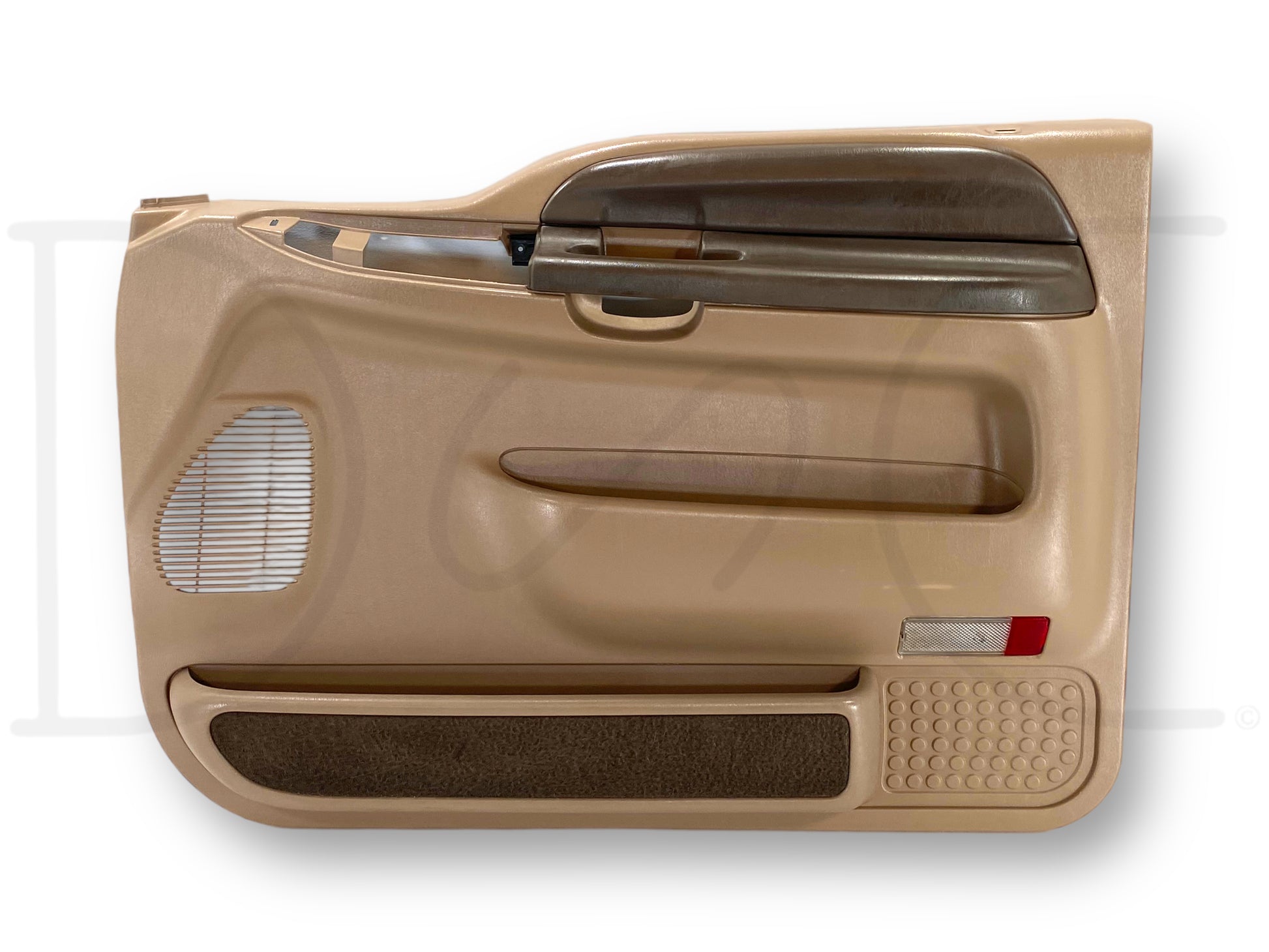 Description: Ford Super Duty right hand passenger side front interior door panel card, tan, for trucks with power windows & locks, OEM