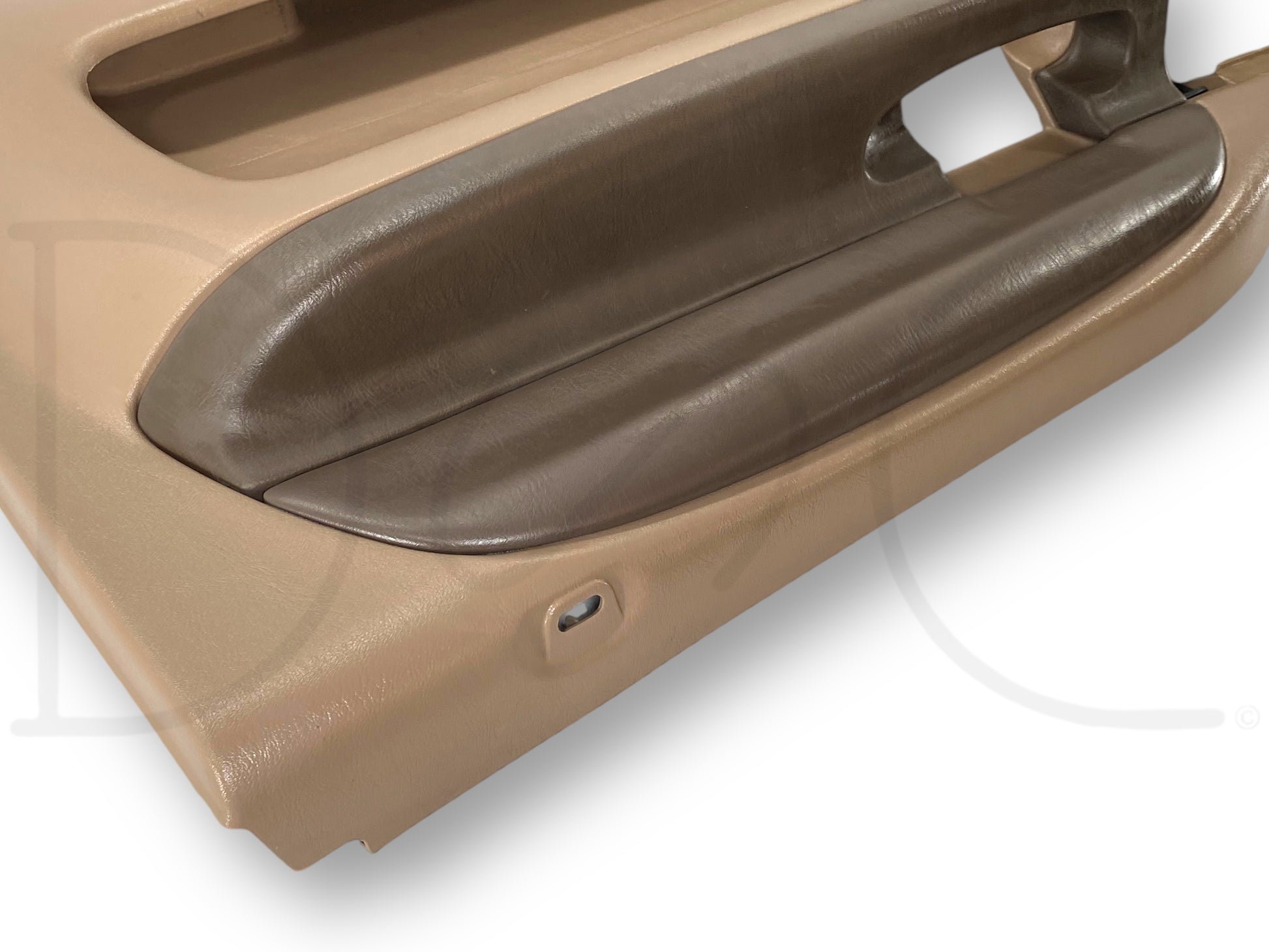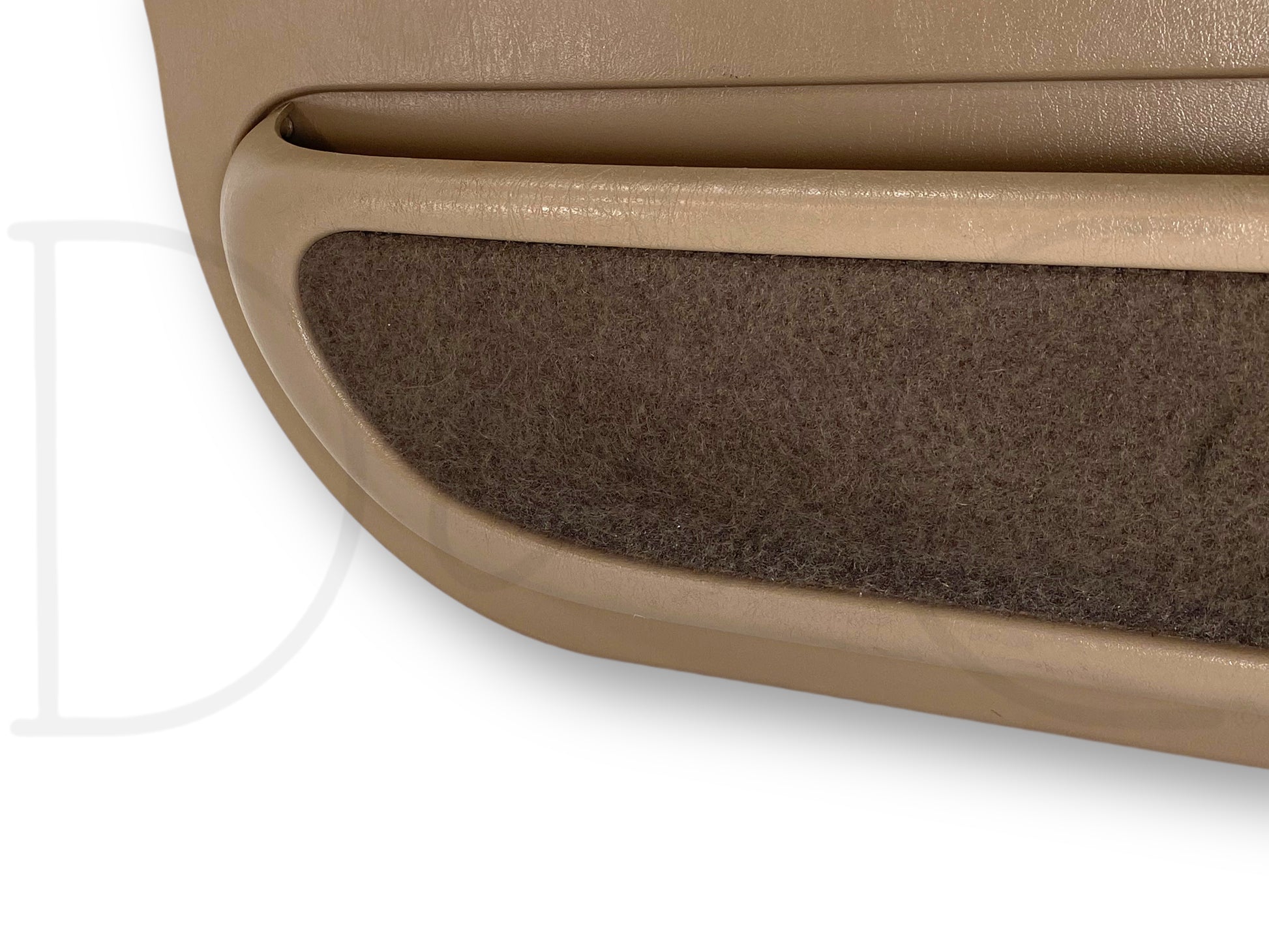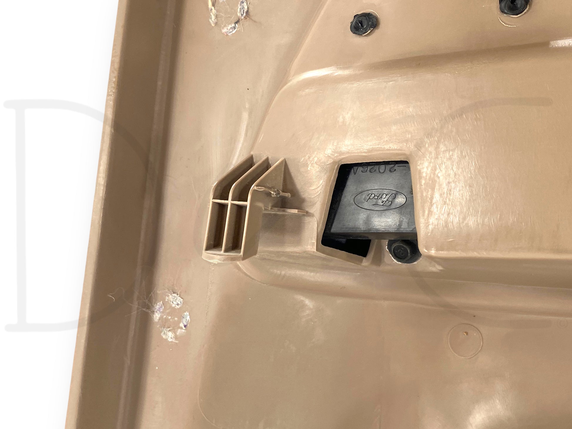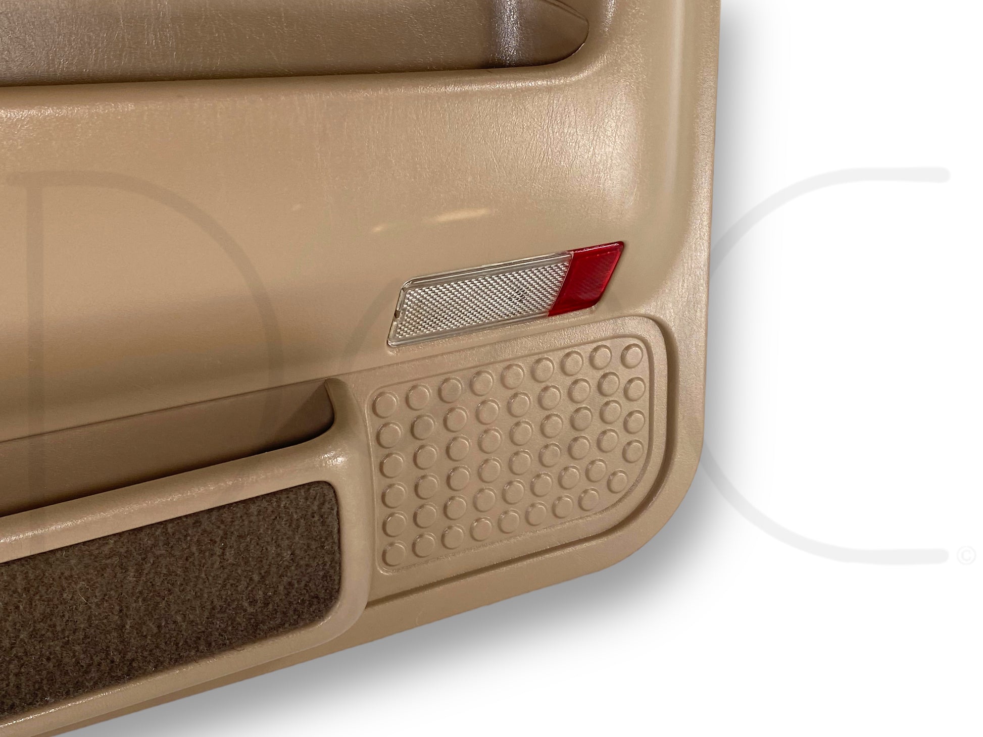 Description: Ford Super Duty right hand passenger side front interior door panel card, tan, for trucks with power windows & locks, OEM