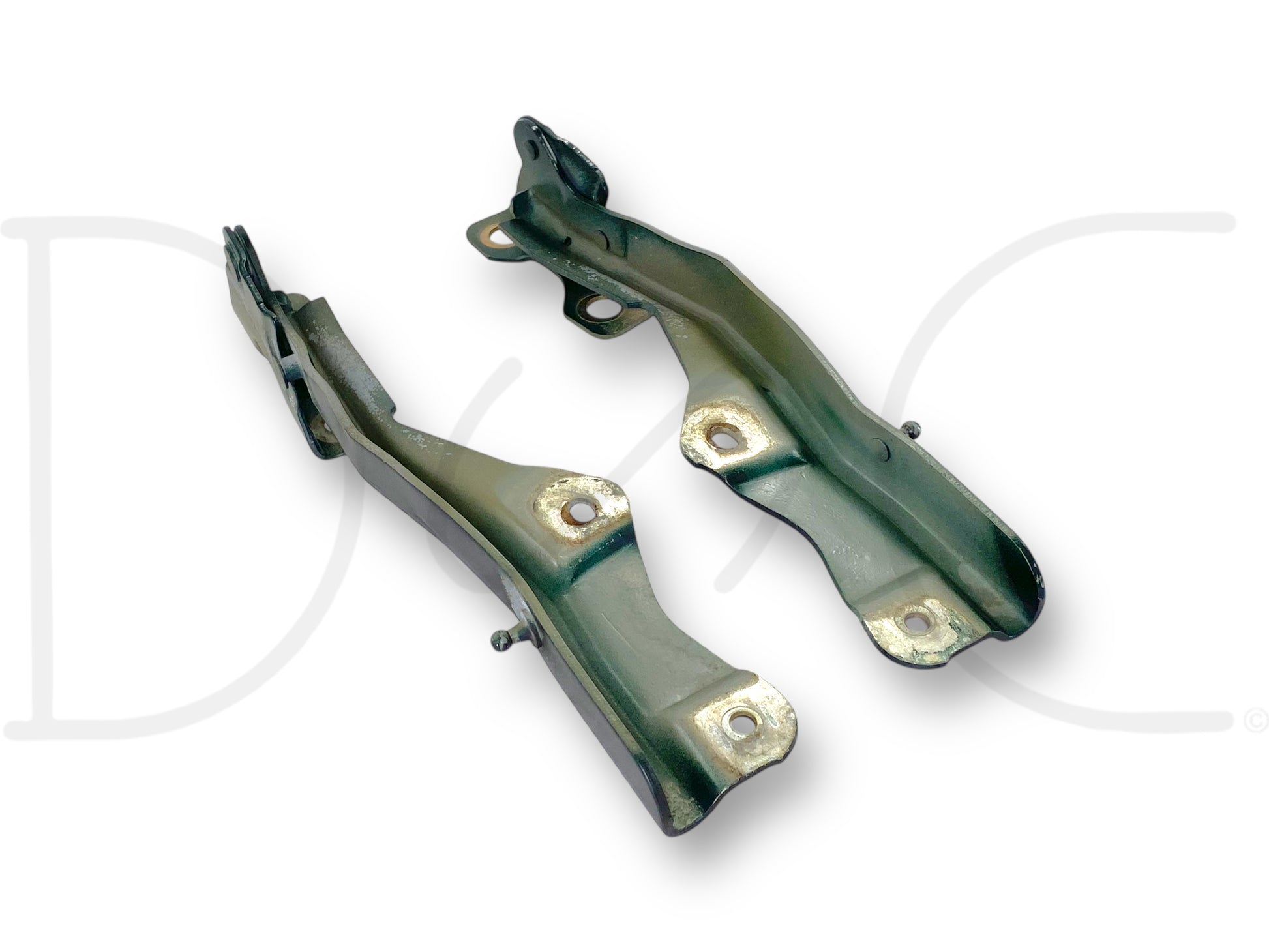 Description: Ford Super Duty front hood hinges, right hand passenger and left hand driver, fv green, OEM