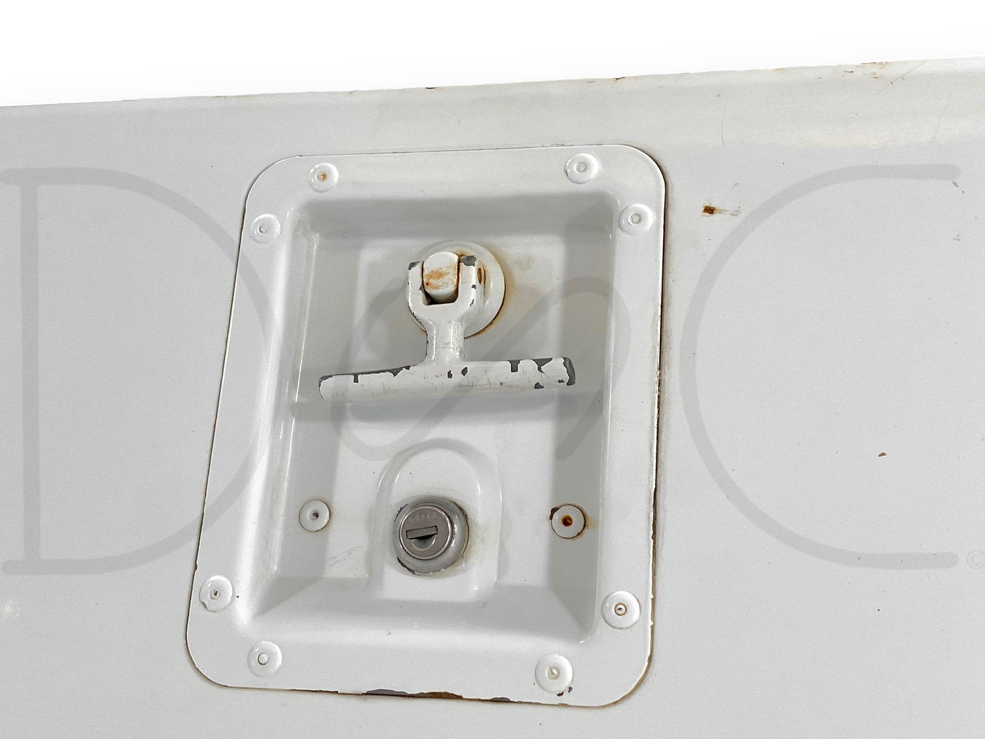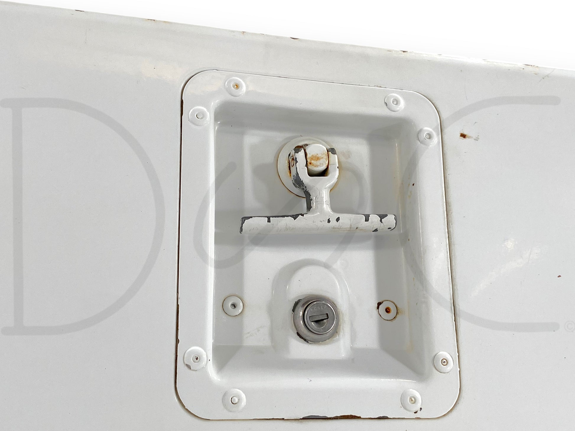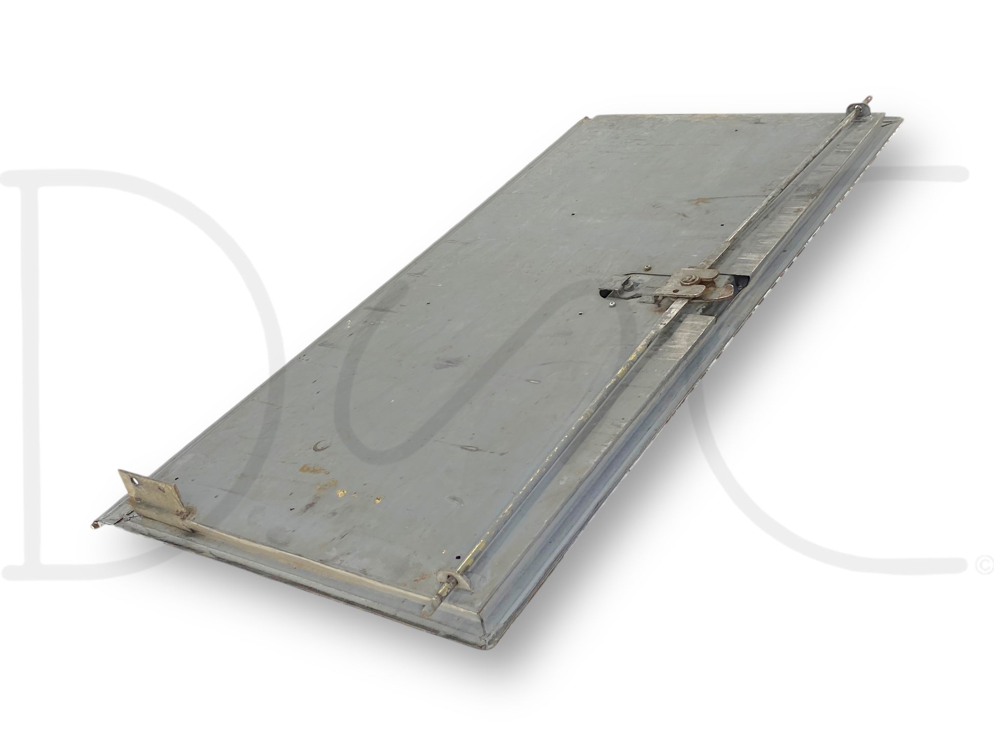 Description: stahl utility bed cabinet door with latch assembly, vertical door (ahead or behind wheel), fits left hand driver side, 19.5" wide by 38" tall